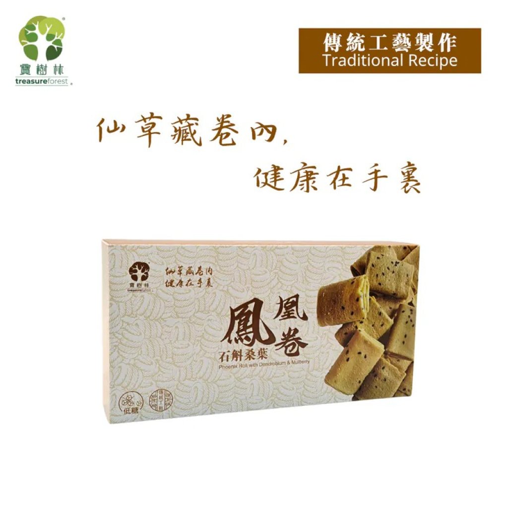 寶樹林石斛桑葉鳳凰卷, 是經過精心選材, 製作出可能是市面上最健康的蛋卷。本產品主要成分採用了鐵皮石斛、桑葉、走地鮮雞蛋和羅漢果糖。產品含糖量比一般的蛋卷少, 石斛滋陰清熱, 桑葉清肝明目、潤肺, 適合大衆或關注血糖人士食用