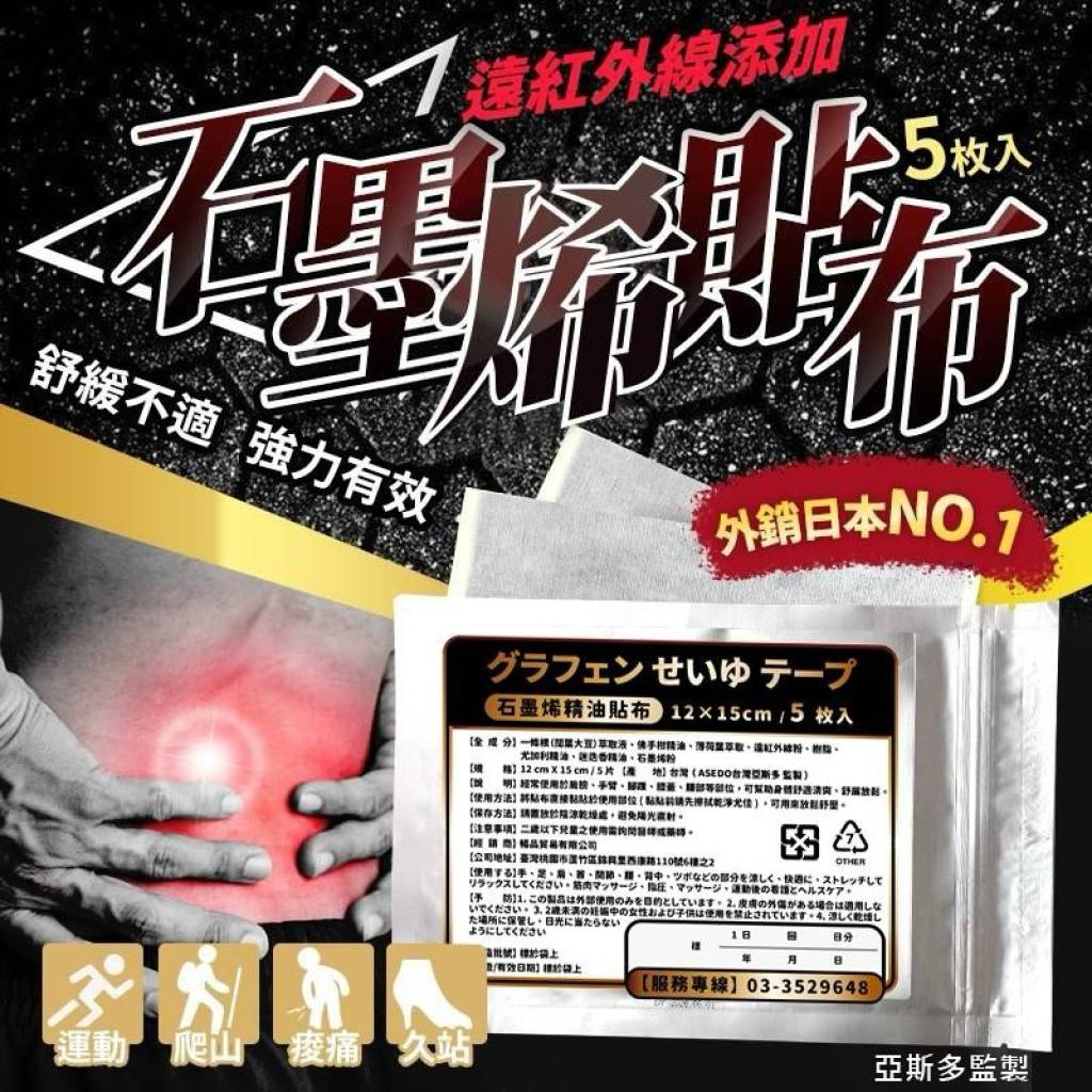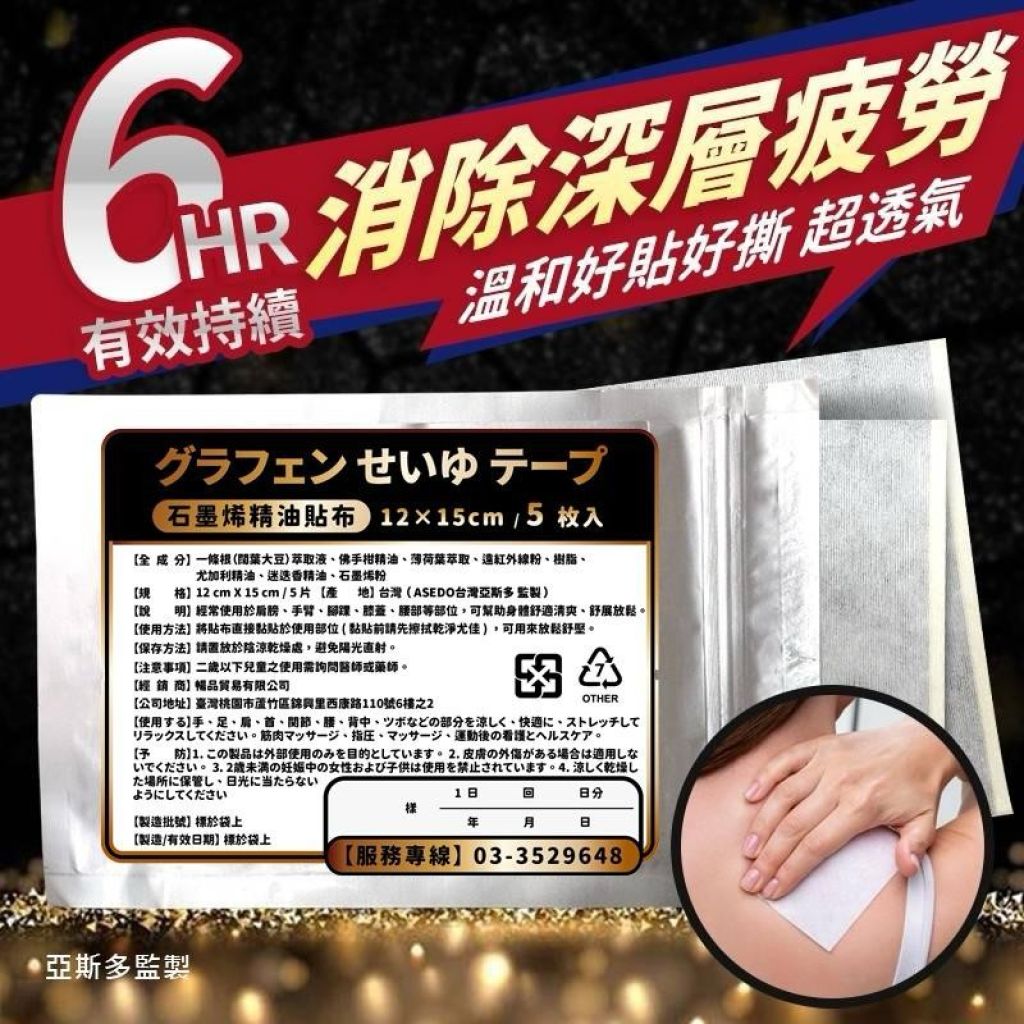 石墨烯材質:貼布中可能含有石墨烯成分,作為導熱、遠紅外、抗菌或能量傳導的素材,協助貼布功能性表現。