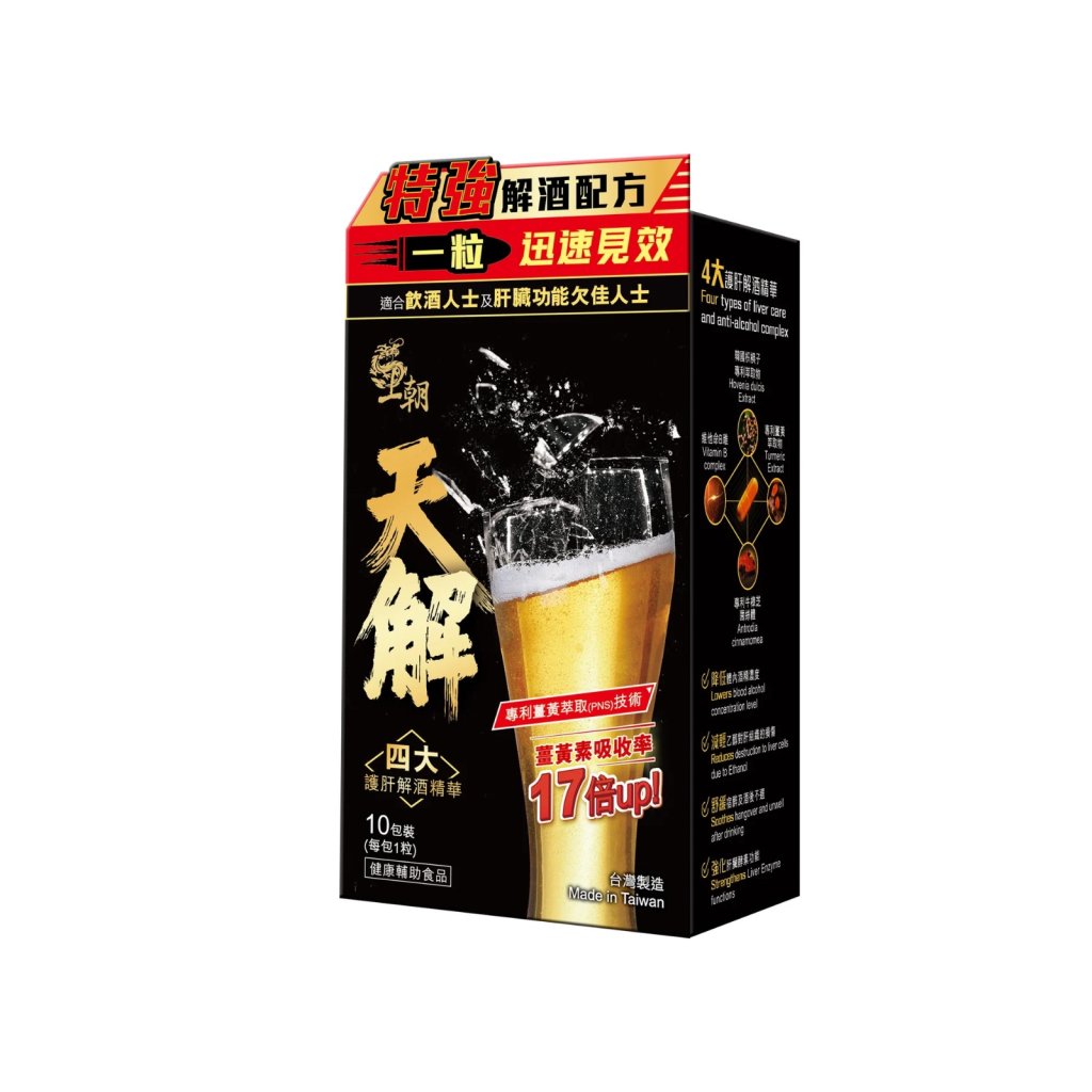 王朝天解護肝解酒膠囊由台灣科研團隊精心研發,1粒速效特強解酒護肝配方,結合4大護肝解酒精華及2大專利技術,有助降低體內酒精濃度、舒緩宿醉及強化肝臟酵素功能 ,讓您盡情享受美酒派對!