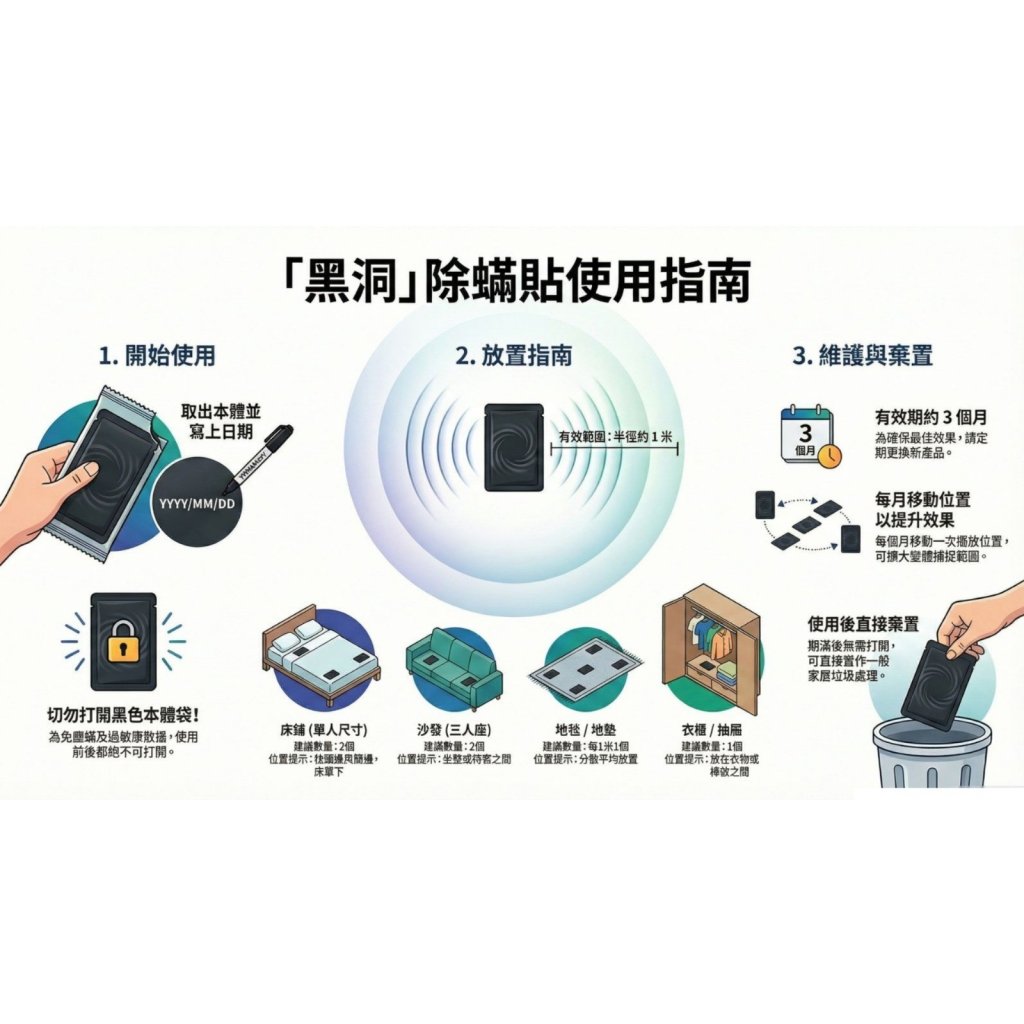 4. 建議用量:每個捕捉貼有效半徑約為 1 公尺。單人床建議放 2 個(頭部與腳部各一);雙人沙發放 1 個,三人沙發放 2 個。