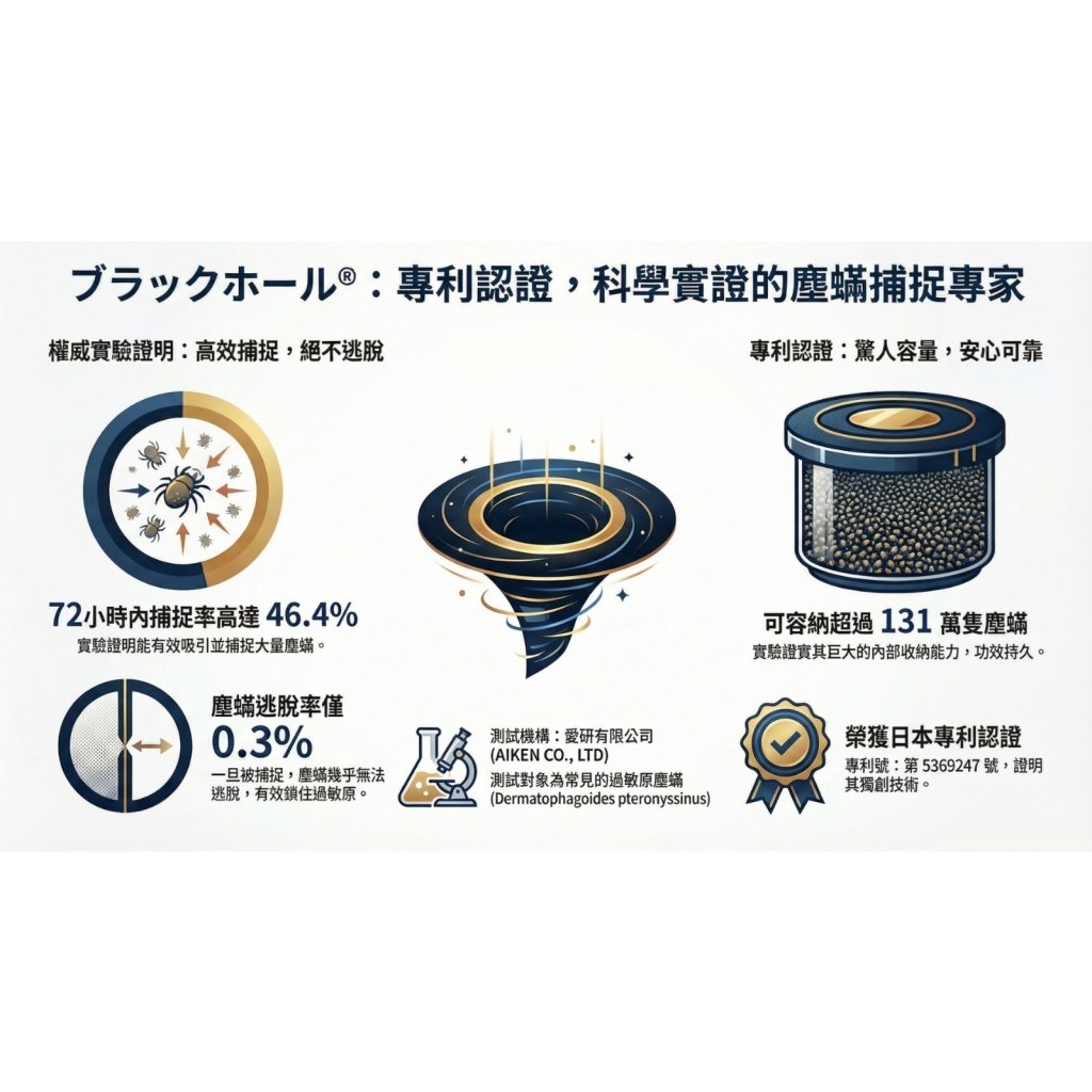 採用日本特許專利技術(第5369247號),這款捕捉貼利用塵蟎的生物習性,打造一個「有進無出」的物理陷阱。產品完全不含殺蟲劑,對人體、嬰兒及寵物安全無害,經實驗證實其捕捉封鎖率高達 99.7%,能有效清除隱藏在家具深處的活體塵蟎。