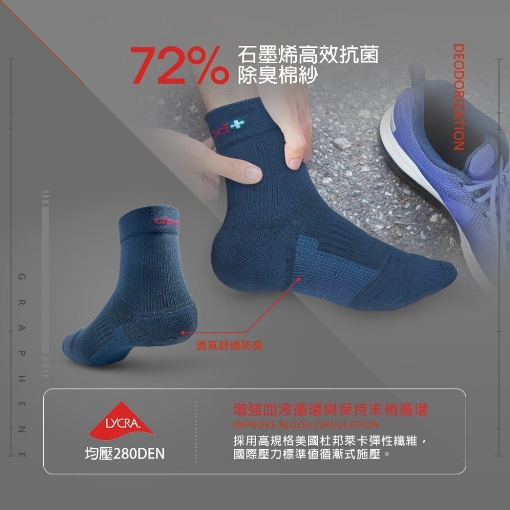 ●72%石墨烯高效抗菌除臭棉紗,採用高規格美國杜邦萊卡彈性纖維,國際壓力標準值循漸式施壓
