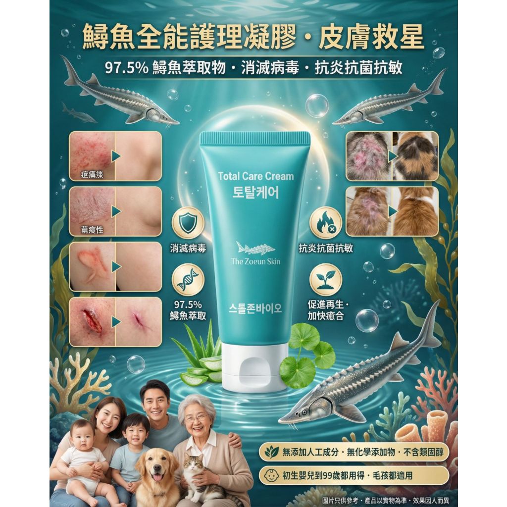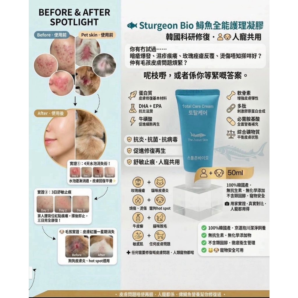 源自韓國專利水溶性鱘魚油科技,Sturgeon Bio 全能護理凝膠以高達 97.5% 鱘魚水溶性油為核心,堅持使用100% 天然由來的原料, NO CHEMICAL 原則,不含類固醇、抗生素與化學添加物,是一款從新生兒到長者、甚至寵物皆可安心使用的全膚況護理凝膠。